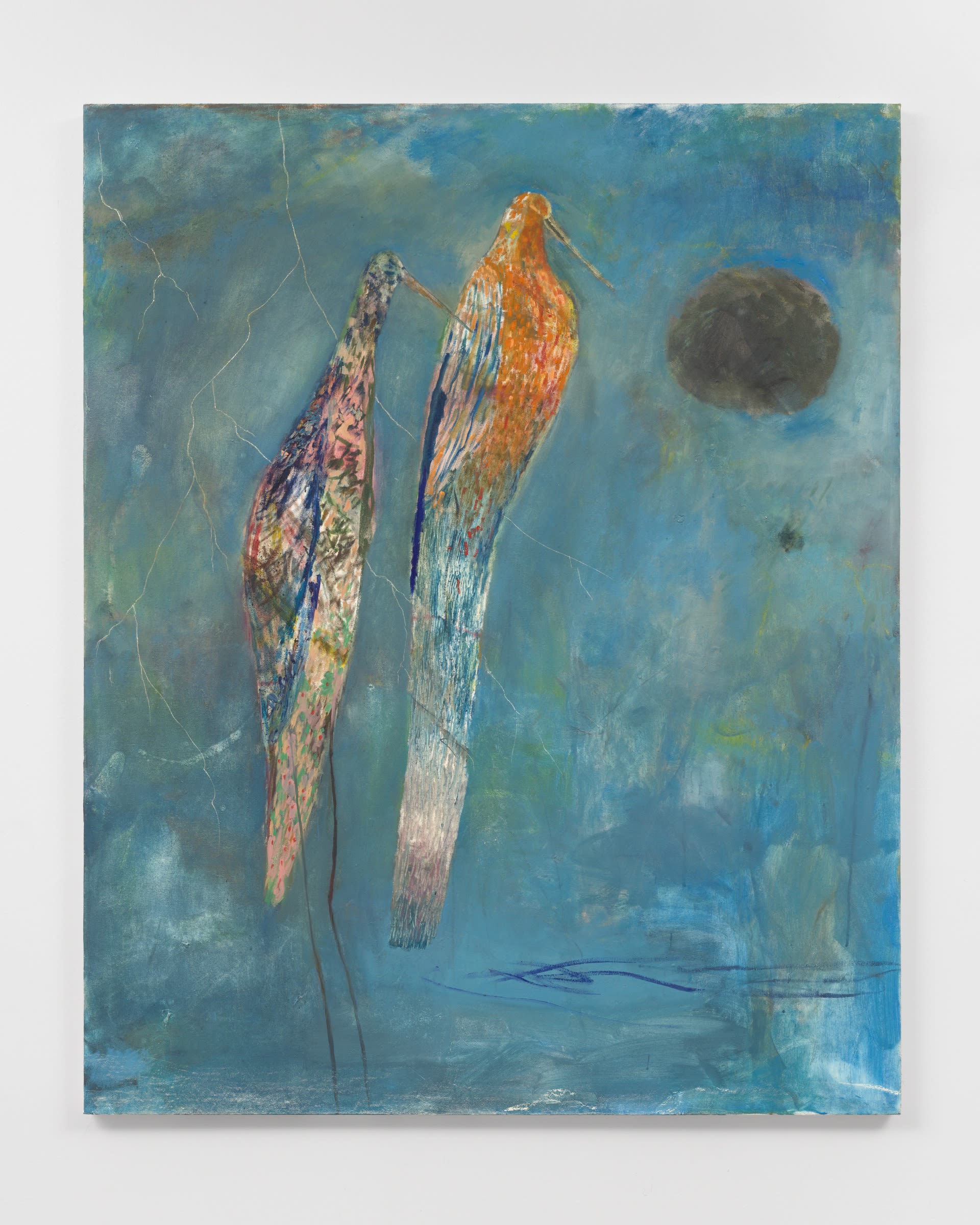 As with most natural creatures, birds are all around us, appearing and disappearing; yet they are also messengers of spring and symbols of migration, landing gracefully, and perhaps perching awkwardly, before us after a long sojourn. Like the act of painting, they convey universal ideas about searching and looking, while also alluding to place and travel, such as the work titled Rockaway Beach, 2021. The light of a distinct sun or moon (seen here as orange, black, and blue orbs) helps to define the weather and the surrounding atmosphere, lushly painted with short, dappled strokes and delicate line work in the blue-tinged In the Still of the Night, 2021, in which a pair of raptors with sharp, pointed beaks sit prone as if on a high perch in the darkness. The birds in Hüller’s new pictures help to locate the viewer – and painter - to stand in place to look out and imagine and picture a site beyond our current condition.